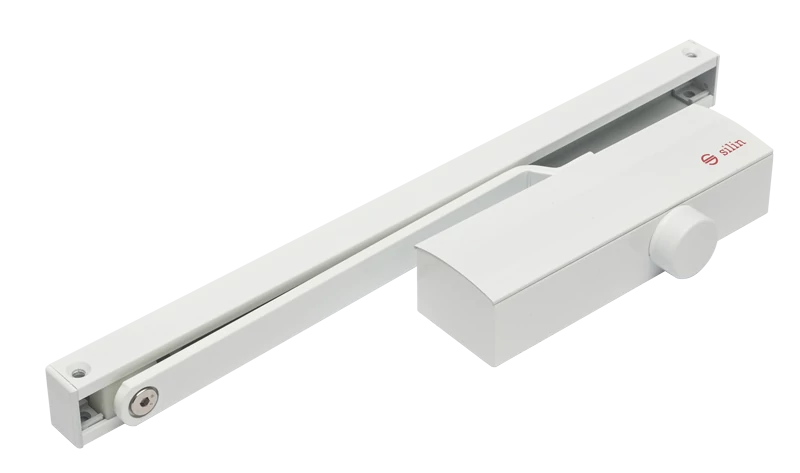 Csúszósínes ajtócsukó termostabil hidraulikus olajjal, 40-65kg-os ajtóra két sebességállítási lehetőség, jobbos vagy balos szerelés, nyitási szög: max 180° 950 mm széles ajtókhoz FEHÉR színben.
