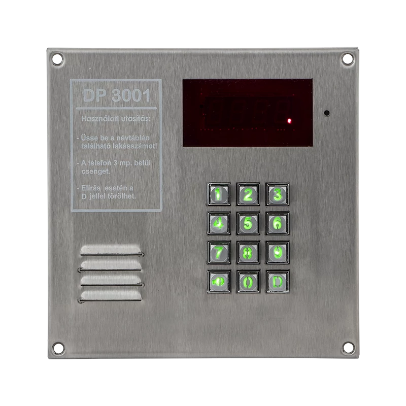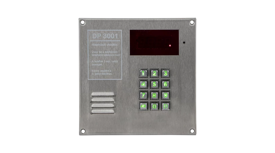A DP3001-INOX egy régi típusú kültéri központ szerelőház nélkül. Fizikai nyomógombokkal és kártyaolvasóval rendelkezik. Inox háza esztétikus megjelenést és tartósságot bíztosít.