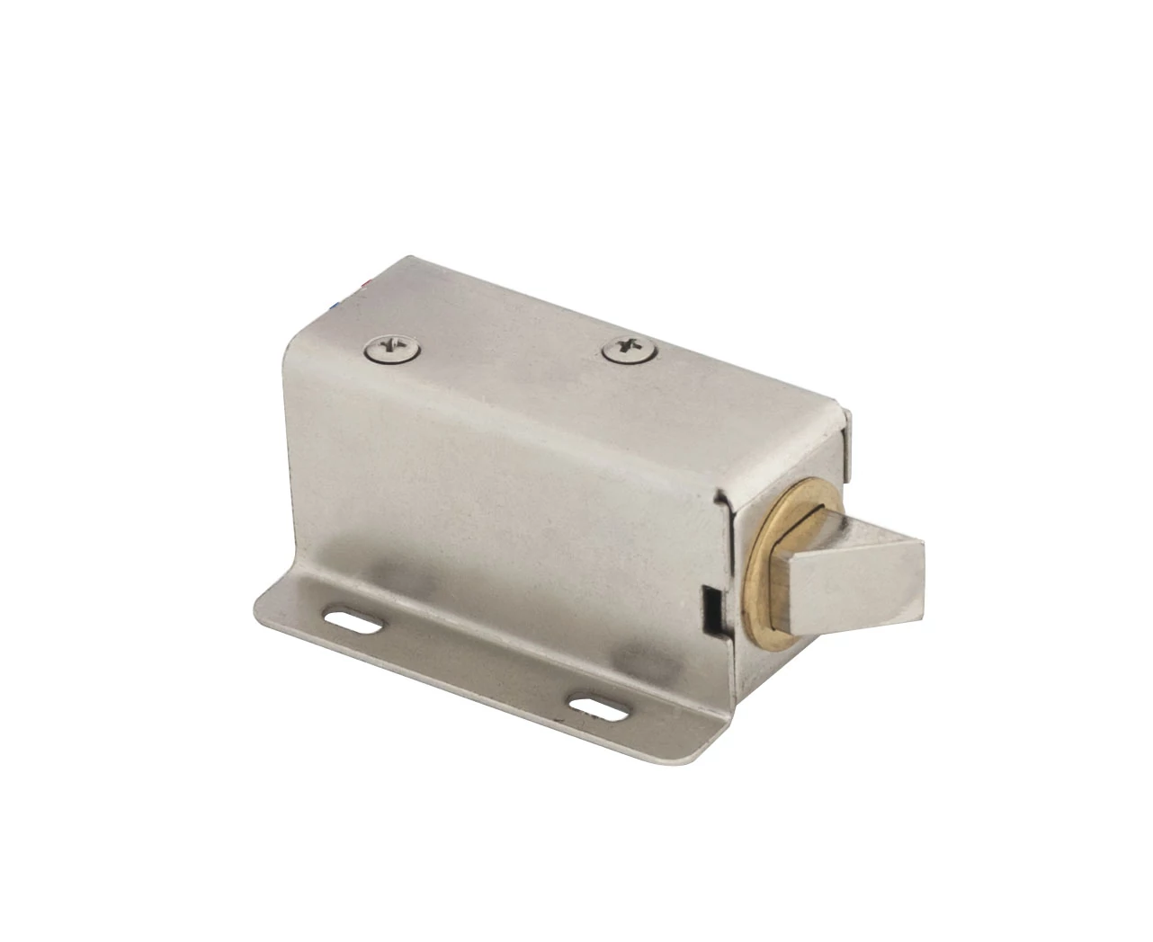 Feszültségre nyíló elektromos szekrényzár 10 mm hosszú csapott nyelvvel. A működéséhez 12V egyenfeszültségre van szükség. Amennyiben az eszköz feszültséget kap, a zár nyelve behúzódik. Telepítése rendkívül egyszerű, működtetéséhez szükség van vezérlőre.