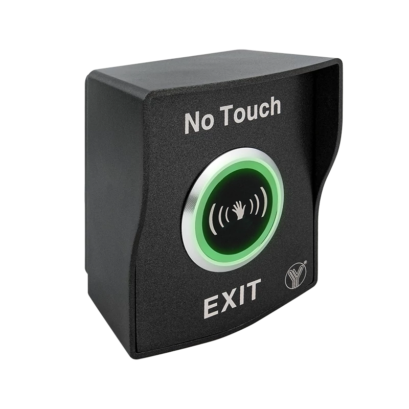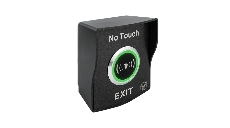 Az ISK-842B(LED)-WP egy közelítésérzékeny kapcsoló esztétikus, feleületreszerelhető fém házban és "NO TOUCH" felirattal a gomb felett, "EXIT" felirattal alatta. A gomb körül gyűrűs LED található, ami kapcsoláskor piros színről zöldre vált.