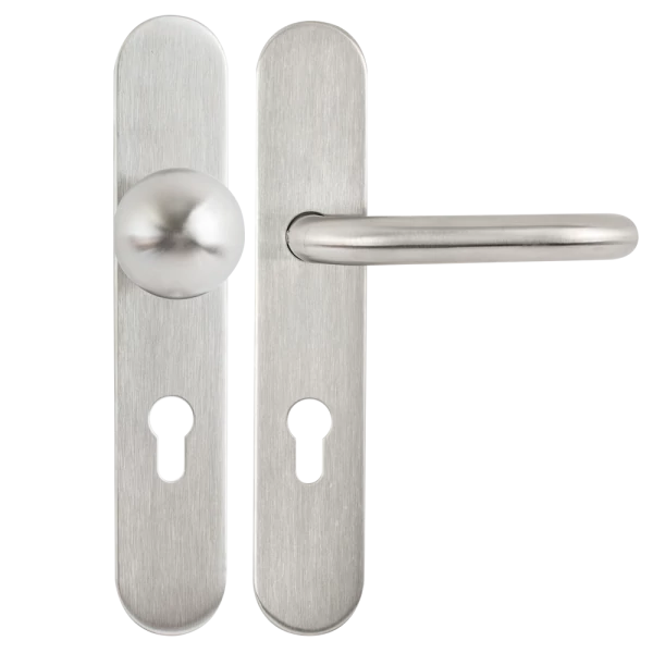 Kívül fix gombos, belül rugós kilincses hosszú pajzs 85mm kilincs-zár távolságú EURO-PROFIL-os cilinderhez. INOX, szálcsiszolt kivitel Rugós kilincs fordítható, jobbos, balos. Tengellyel, és rögzítő csavarokkal.