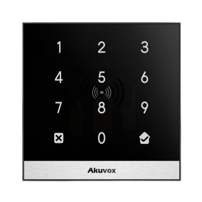 Akuvox A02S - Kültéri, önálló működésű kód-és RFID olvasó, edzett üveg előlappal, fekete fém házban.