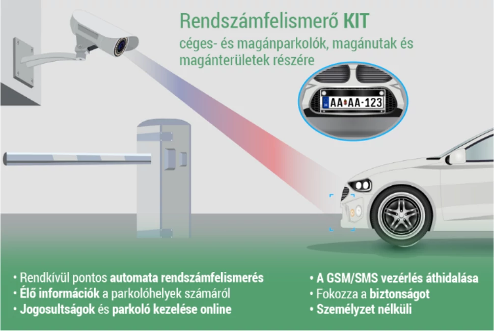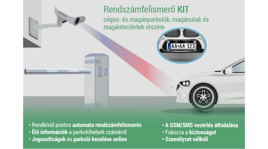 R-Rendszaáfelismerő KIT automata rendszám felismerő kamera rögzíti a jármű képeit és felismeri a rendszámtáblákat a mozgó járműveken, ezáltal lehetővé teszi az automatikus be- és kilépést bármely fizikai parkoló rendszerhez például sorompó. A rendszer lehetővé teszi a külső beavatkozás elkerülését és a személyes felügyelet mellőzését.