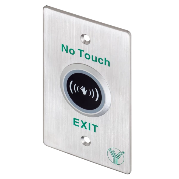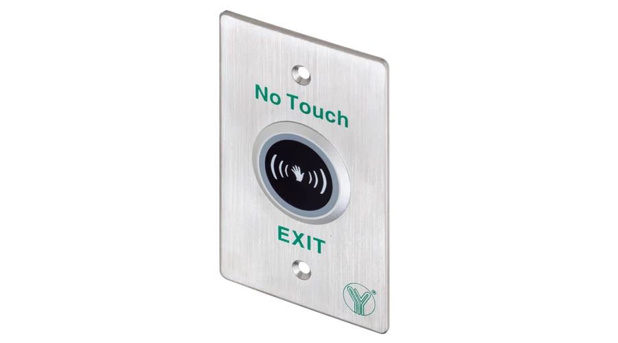 Az ISK-841C egy közelítésérzékeny kapcsoló esztétikus, rozsdamentes acél pajzzsal, "NO TOUCH" felirattal a gomb felett és "EXIT" felirattal alatta. A gomb körül gyűrűs LED található, ami kapcsoláskor kék színről pirosra vált. A nyitási időzítés potméterrel állítható.